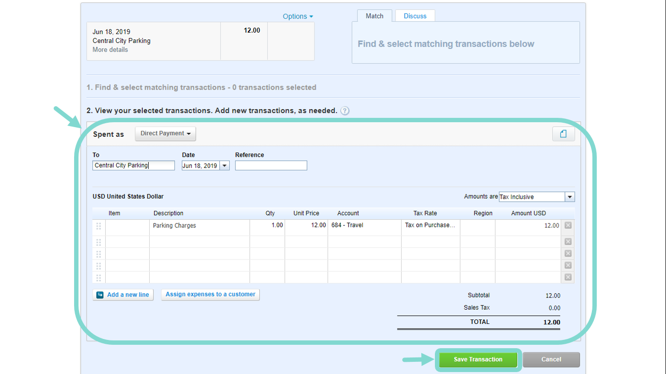 You may fill in additional details or split the transaction to different accounts at section 2. Once you have completed, click Save Transaction.